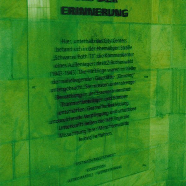 Im Rahmen der Ausstellung -Essen erlebt Architektur- erinnern der Architekt Prof. Werner Ruhnau und die Künstlerin Astrid Bartels mit ihrer Arbeit „Stadtwunde“ an das SS-Strafgefangenenlager Schwarze Poth 13, Außenlager Buchenwald 1943-1945.