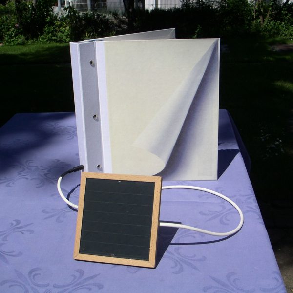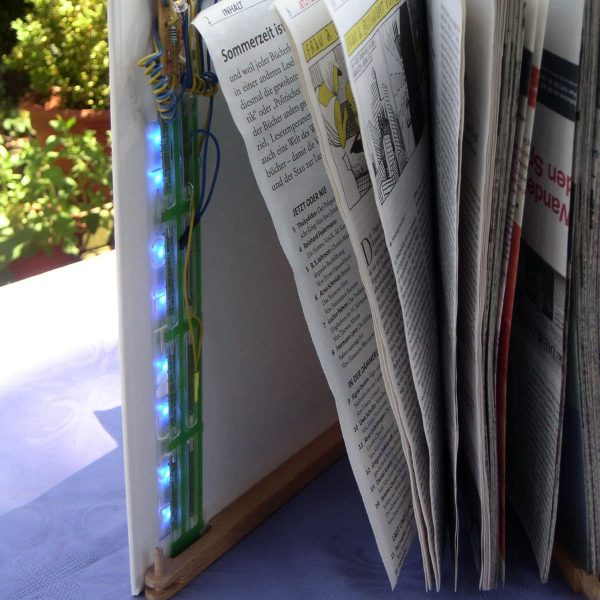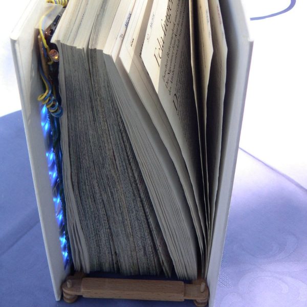 Solarpanel lädt einen Akku, der den Schriftzug des Buchobjektes blau hinterleuchtet. Kunstbjekte Übersicht 07/29/2018Album-NavigationZurückVorheriges Album:Schaukelpferd